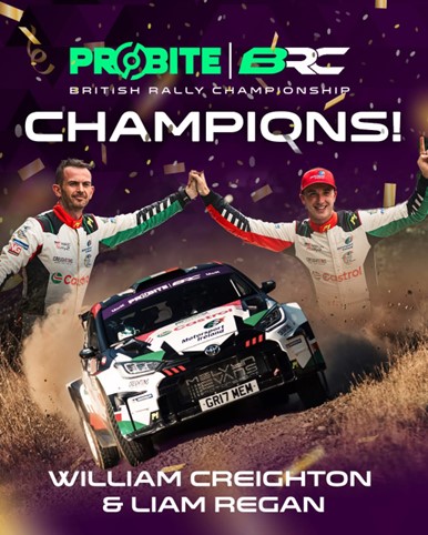Moira’s William Creighton and his Belfast co-driver Liam Regan are the 2025 Probite British Rally Champions. The Northern Ireland pairing, who were 2021 Junior BRC and 2023 Junior WRC champions, clinched the title on the sixth and final round, the Cambrian Rally in the world-famous North Wales forest complexes of Brenig, Clocaenog & Alwen.