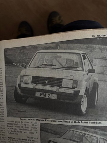 We were timekeeping at Nutts Corner when a bright new star, 18-year-old Stephen Finlay, driving a Talbot Sunbeam Lotus (PIA 21), won the SC Engines sponsored Autumn Stages Rally organised by North Armagh Motor Club. Finlay was co-driven by Norman Kittle (photo below from Carsport) Second overall was Dungannon’s Kenny Colbert in a similar car. Harry Burke finished third in a Ford Escort 1600. The event included 14 special stages on a variety of surfaces, with a total of 20 stage miles. The majority of the tests were in and around the old runways of the Nutts Corner complex In Co.Antrim.