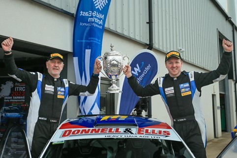 Alastair Fisher (right) and co-driver Gordon Noble celebrate their 2022 Circuit of Ireland victory.